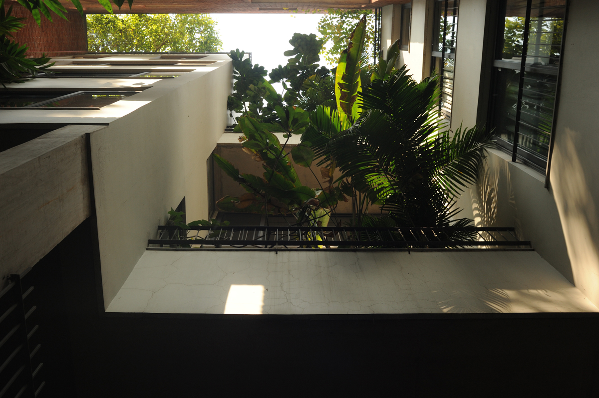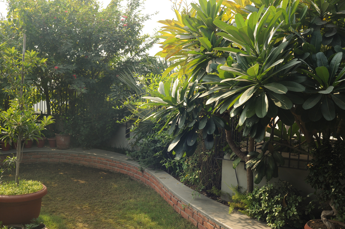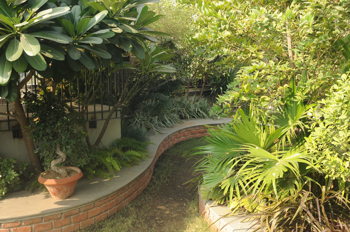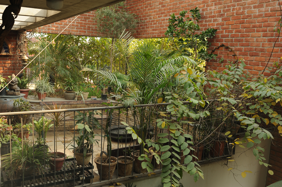 Set in a busy residential neighbourhood of Delhi, the house designed by Studio Lotus, looks inward for inspiration. The design intent of this multilevel garden is to create a forest in the middle of crowded city. With a love nature and plants, the client sought a design that has trees popping out of the building. Large planters were created on different levels to support trees and shrubs. An informal, curvy geometry is used to convey the fluidity of nature. On the rooftop, lawn and lush tropical plantings, and a historical Kerala verandah are used to transport the user to a different reality. Strategically placed planters screen off the ugliness of the surrounding broken roofs, plastic water tanks and cell towers.