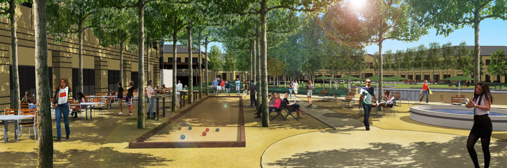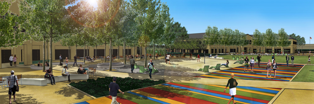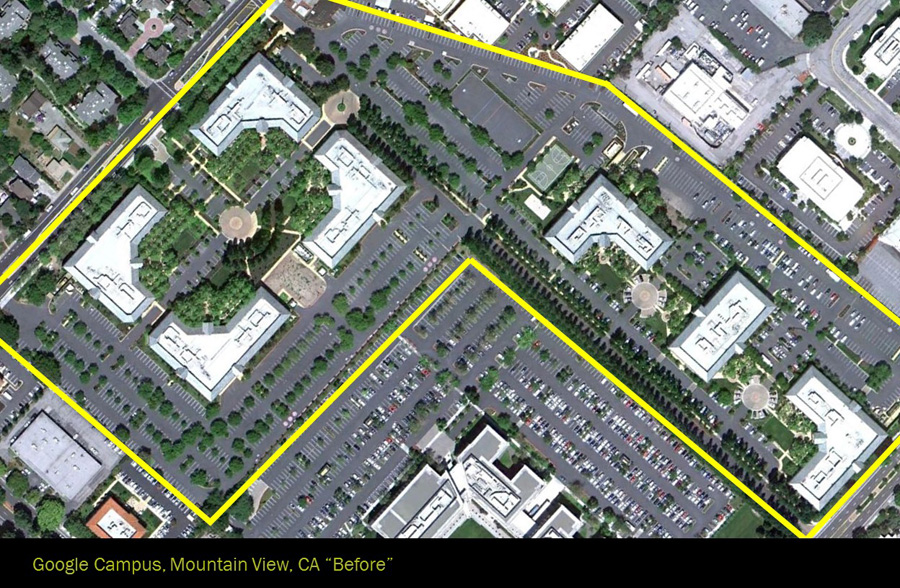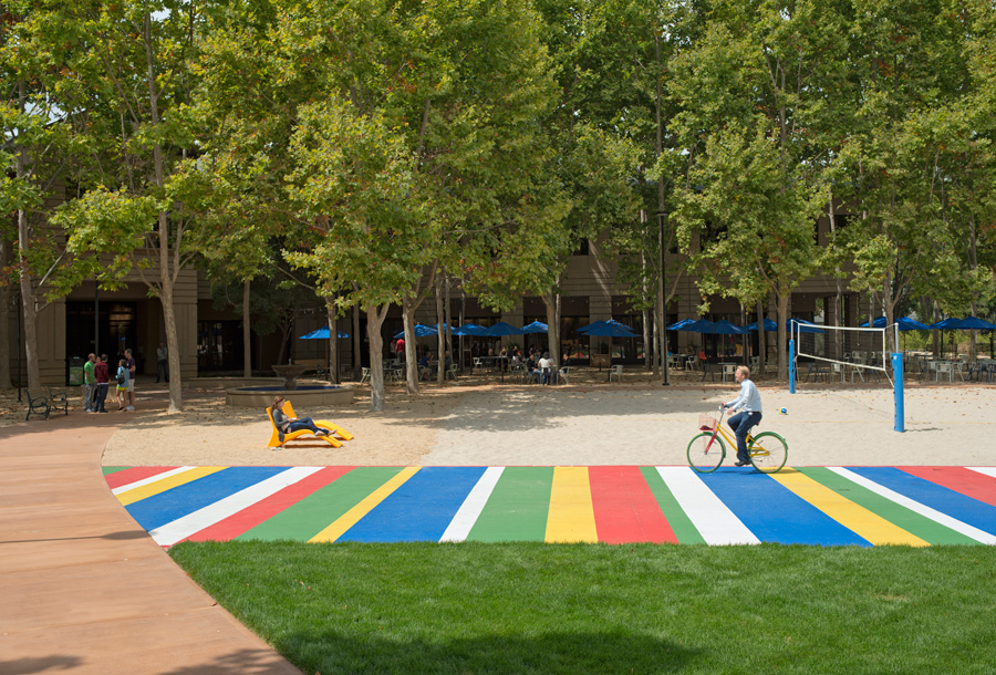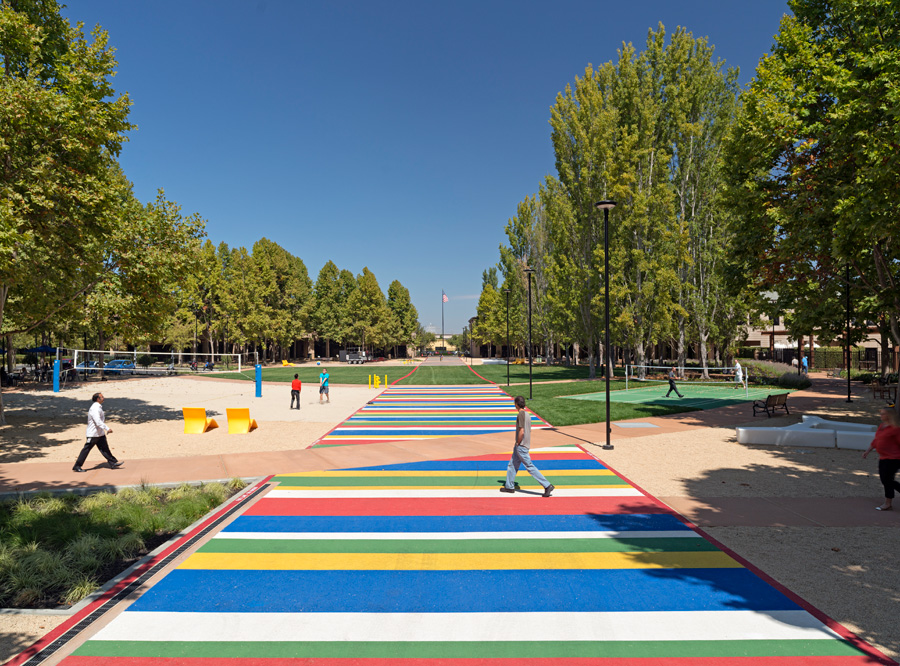 Built in the late 1990’s to support a variety of tenants, this 29-acre office park was renovated by Google to support its rapidly growing workforce. In collaboration with Gensler Architects, Aditya designed site improvements to unify and connect the site’s seven buildings to create a more cohesive campus. The quadrangle formed between four buildings was pedestrianized as a common space. The central fire truck road was retained but a bold and colourful patterning of the asphalt ground plane, with new recreational activity spaces besides it, energized the whole space.